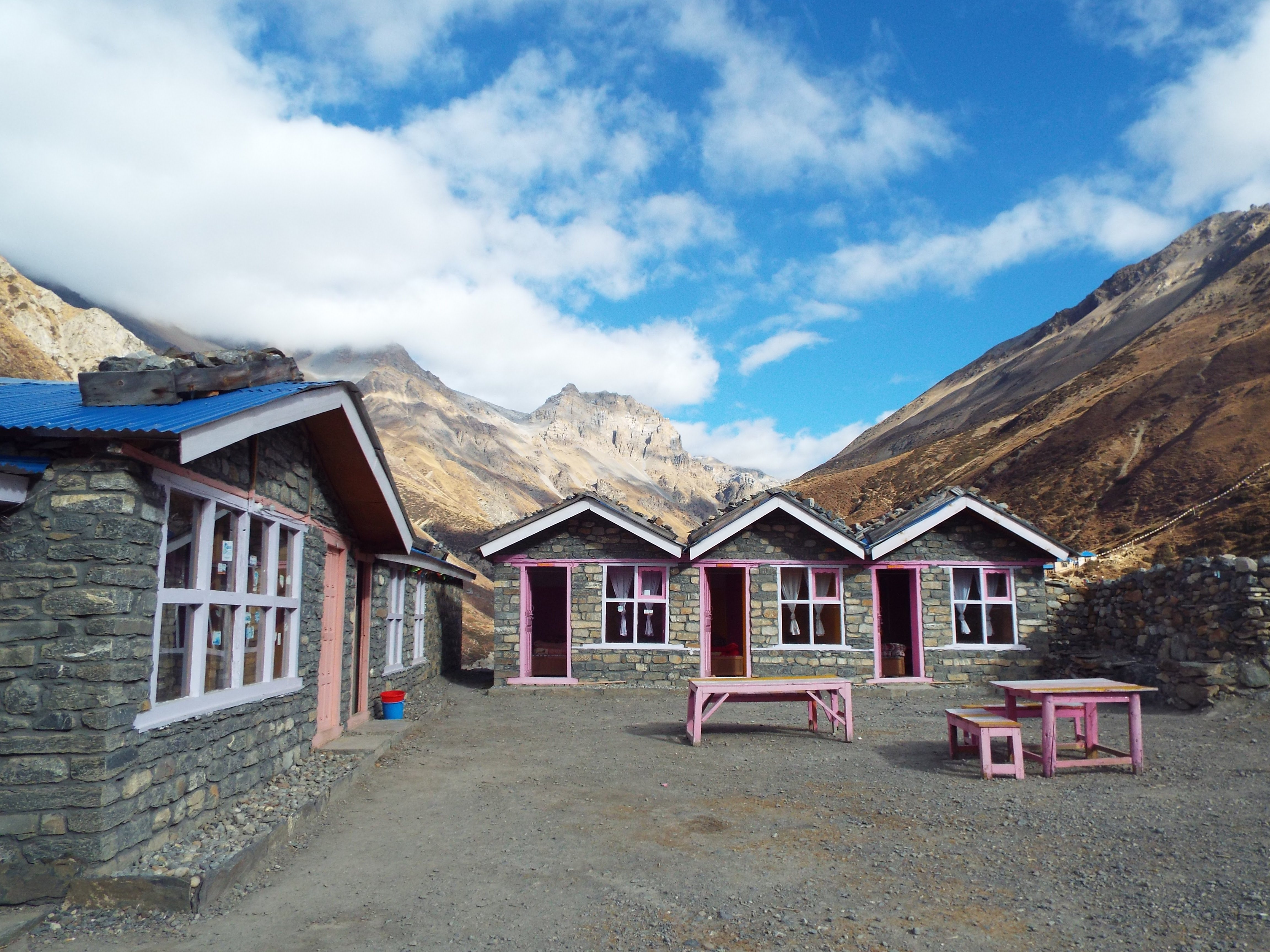Nous venons d’arriver dans une petite guesthouse à Ledtar, à 4 400m d’altitude. Cette journée de marche n’a pas été très agréable. Pourtant nous étions bien reposées après 2 nuits passées à Manang. J’ai eu des difficultés à respirer pendant toute la journée. J’imagine que ça fait partie du jeu, plus nous gagnons en altitude et plus nous avons du mal dans l’effort physique. On traîne dans la salle commune, près du poêle. Les chambres ne sont pas vraiment isolées contre le froid (quelques planches en bois en guise de murs), et il fait -15° dehors, alors on profite de la chaleur ici. Nous avons rencontré 2 français et 1 argentin, qui n’a même pas de sac de couchage et qui paraît très en forme. Avec eux, j’ai appris un nouveau jeu de cartes, le “Tamul”, plutôt sympa mais l’exercice de rapidité est trop intense pour mon cerveau embrouillé.