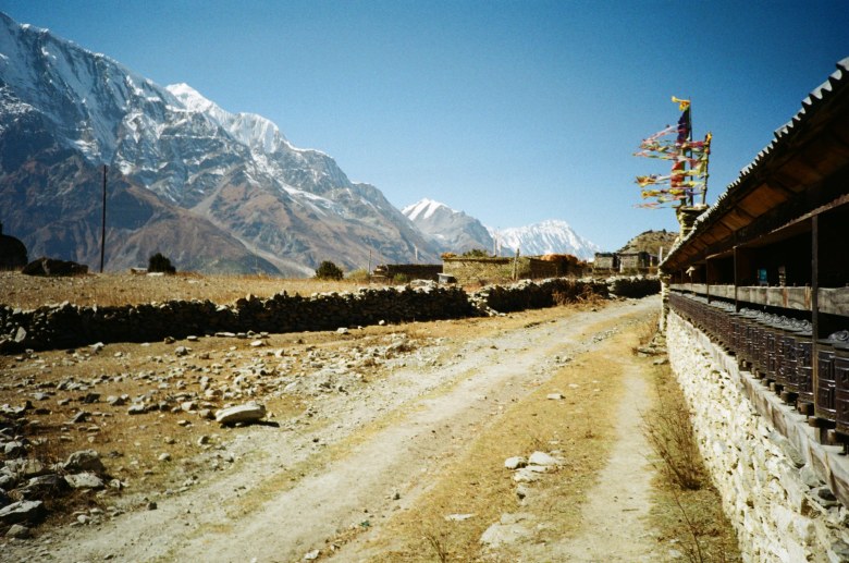 Cette journée de marche fut la plus difficile depuis notre départ. Le vent nous accueillant à Manang était l’un des plus forts que j’aie connu jusqu’ici, nous avions de la peine à avancer. Nous avons définitivement perdu la trace d’Eric et Bernard, qui ont pris un autre chemin, ils ont une journée d’avance sur nous. La cohabitation avec Mathilde se passe toujours aussi bien, nous avons notre petite routine. Les paysages lunaires vus aujourd’hui m’ont transportée dans un autre monde. L’impression d’être coupée du temps, à des milliers d’années-lumière des tracas de ma vie parisienne. Comment les retrouver après ça ? Nous sommes à Manang, à 3600m d’altitude. J’écris depuis la petite chambre au fond du jardin du Tilicho Hotel, qui contient son lot de touristes occidentaux, français pour la majorité. Riant fort et buvant du whisky – c’est assez évident qu’ils ne portent pas leur sacs. Demain nous ne marcherons pas, nous restons une journée à Manang pour s’acclimater. Je vais sortir pour faire une lessive de fringues dans la cour de l’hôtel, j’ai vu qu’il y avait un seau.
