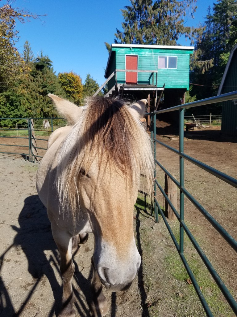 – L’après-midi avec les magnifiques chevaux d’Yvonne, la voisine. Elle a tenu à ce que je monte sur chacun d’entre eux : “There are all different, you have to try all of them”