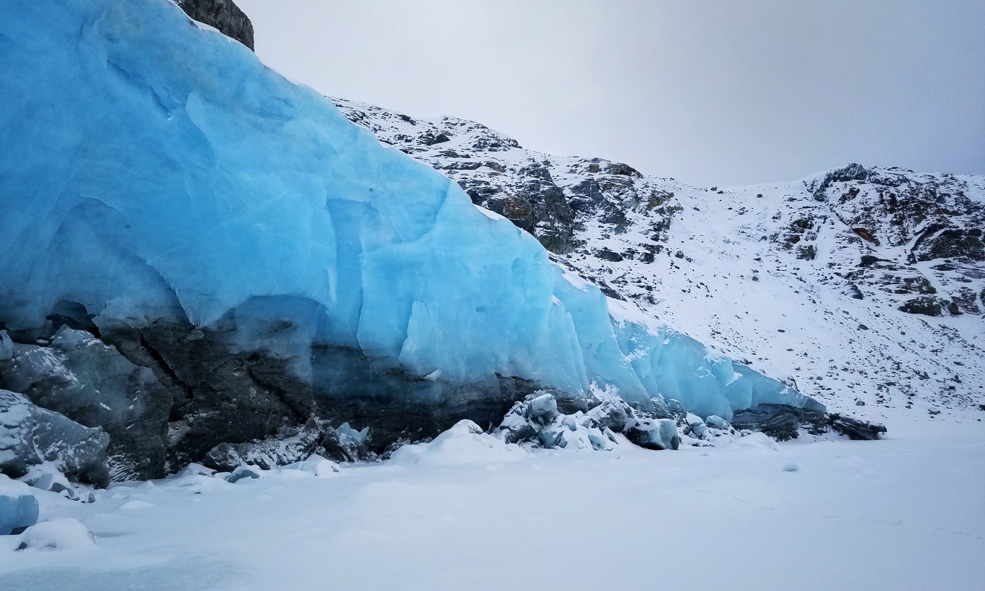 Le glacier est d’un bleu éclatant. Deux randonneurs sont perchés sur un côté du glacier. Nous préférons rester en bas et l’admirer d’un peu plus loin. Quelques photos plus tard il est temps de redescendre si nous voulons être à la voiture avant la tombée de la nuit.